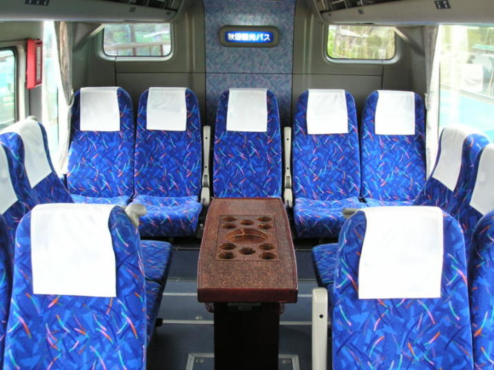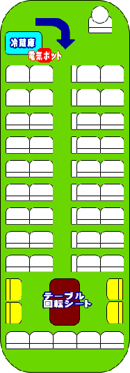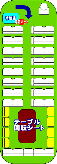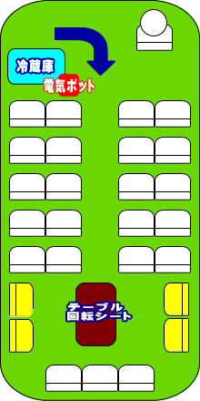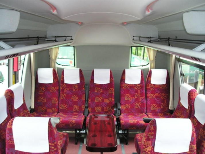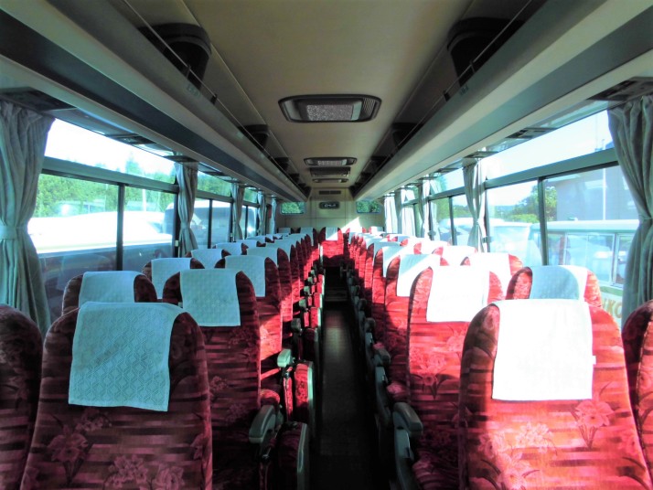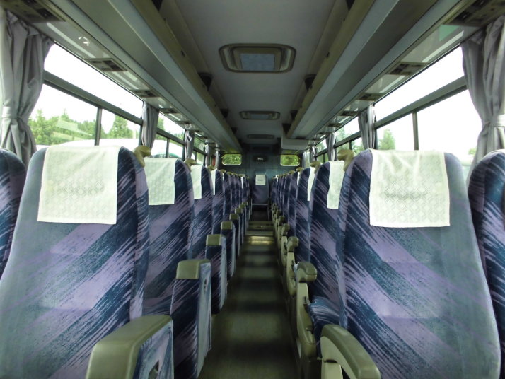 | 客席45+補助席8 運転席1 ガイド席1 座席回転式二列サロン 湯沸かしポット 冷蔵庫 カラオケ 地デジ DVD 2スパン貫通トランク |